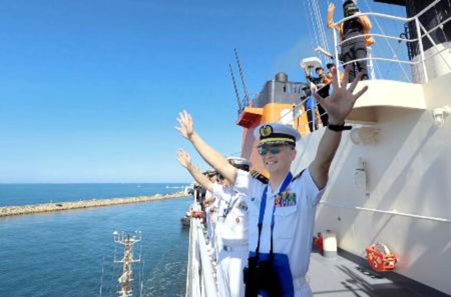 オーストラリア西部・フリマントルに入港し、手を振る南極観測船「しらせ」の乗員=23日(南極観測隊同行記者撮影)