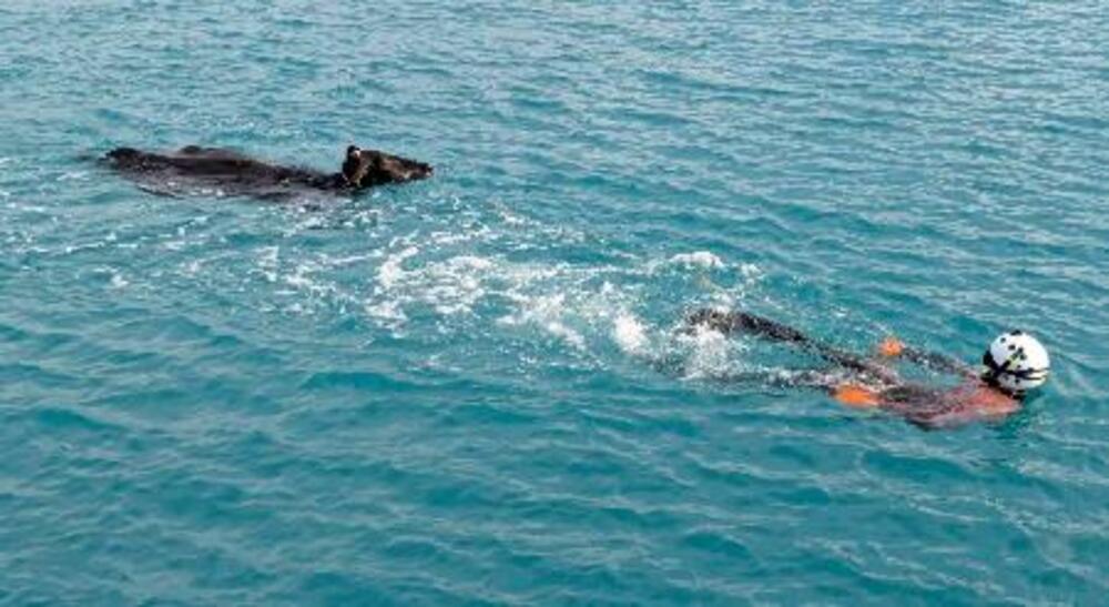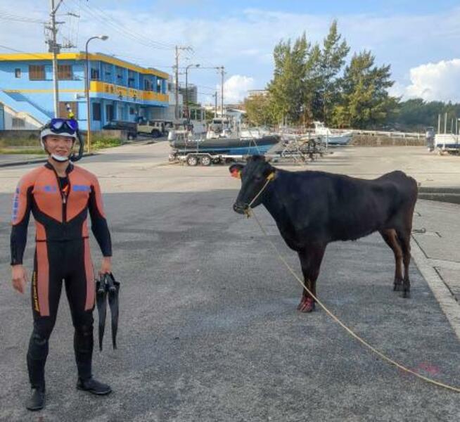 男性潜水士に救助された牛=23日、沖縄県・宮古島(宮古島海上保安部提供)