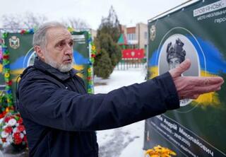 息子の遺影の前で取材に応じるミコラ・シロババさん=23日、スラビャンスク(共同)
