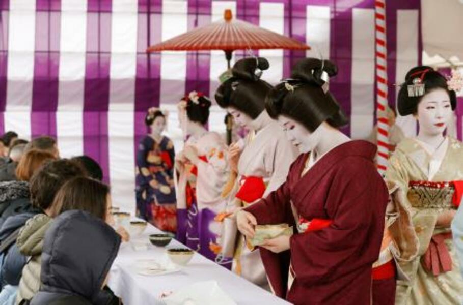 京都・北野天満宮の「梅花祭」で開かれた野だて茶会で参拝客をもてなす芸妓や舞妓=25日午前