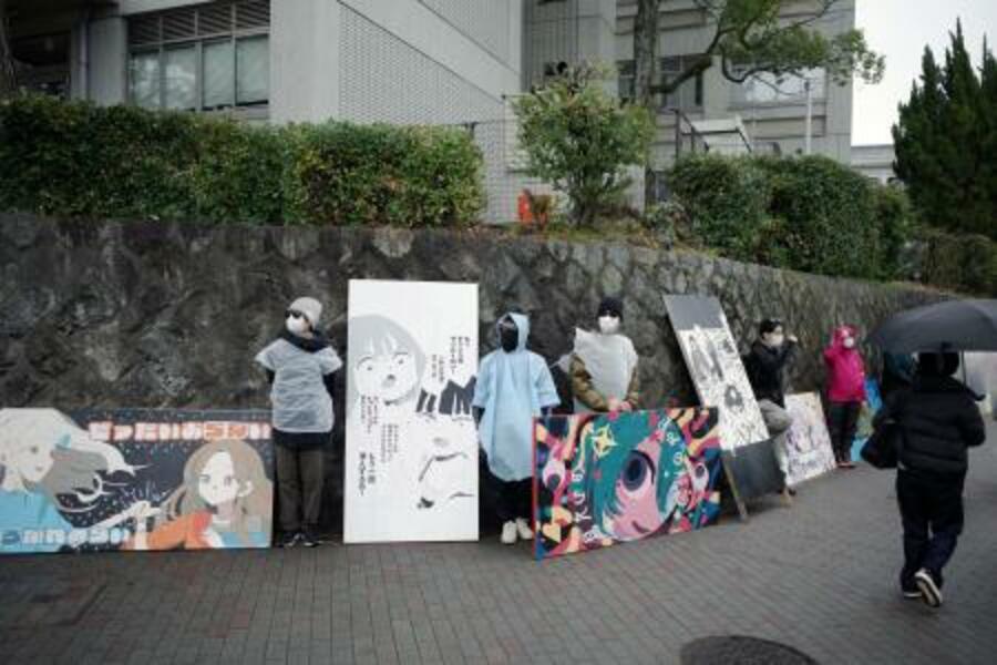 京都大前の歩道に並べられたタテカン=25日午前、京都市左京区
