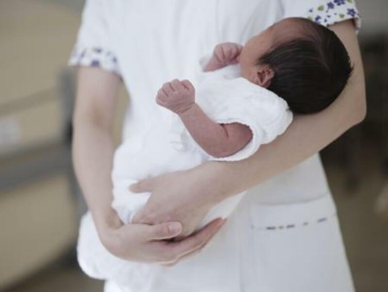 病院で助産師に抱かれる新生児