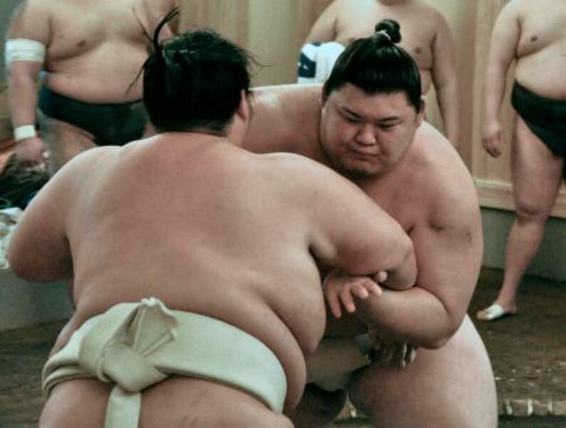 出稽古に来た琴桜と相撲を取る大の里=大阪府東大阪市の二所ノ関部屋宿舎