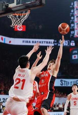 日本―中国 第4クオーター、シュートを放つ西田(右)=沖縄サントリーアリーナ