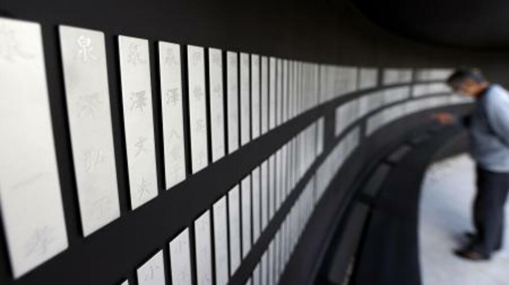 犠牲者の名前が家族単位で並べられた「釜石祈りのパーク」の慰霊碑=2020年3月、岩手県釜石市