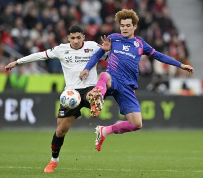 レーバークーゼン戦で競り合うマインツの佐野海(右)=レーバークーゼン(共同)