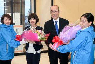 石川県輪島市長選で無投票での再選が決まった坂口茂氏(右から2人目)=1日午後、輪島市