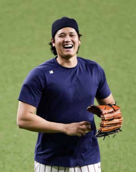 練習中に笑顔を見せる大谷=京セラドーム