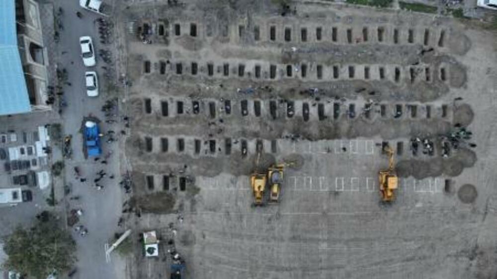 2日、イラン南部ホルムズガン州で並べられた犠牲者の墓(イラン当局提供・ロイター=共同)