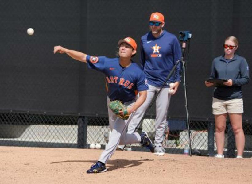 ブルペンで投球練習するアストロズ・今井=ウェストパームビーチ(共同)
