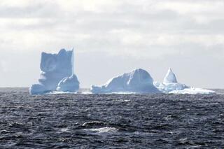 南極観測船「しらせ」の近くには、ぽつぽつと氷山が浮いていた=6日、東南極のトッテン氷河沖(南極観測隊同行記者)