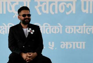 ネパール・ジャパにある党の事務所で話をするラッパーのシャハ前カトマンズ市長=2月(ロイター=共同)