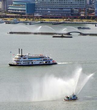遊覧船などが湖上をパレードした「びわ湖開き」=7日午前、大津市沖(共同通信社ヘリから)