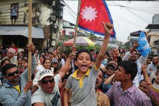 ネパール下院総選挙で、ラッパーのシャハ前カトマンズ市長の勝利を喜ぶ人たち=7日、ダマク(ロイター=共同)