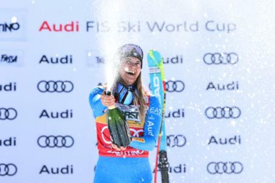 アルペンスキーW杯、女子滑降第8戦を制し、喜ぶラウラ・ピロバノ=7日、バルディファッサ(AP=共同)