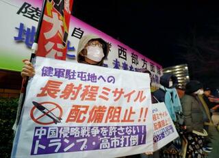 熊本市の陸自健軍駐屯地前で、長射程ミサイルの配備に反対する人たち=8日午後8時29分