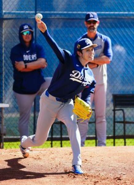 ブルペンで投球練習するドジャース・佐々木=グレンデール(共同)