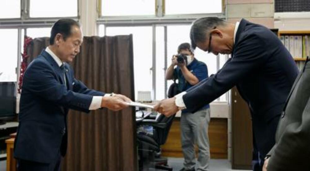 米軍ヘリの緊急着陸を受け、防衛省沖縄防衛局の村井勝局長(右)に抗議文書を手渡す沖縄県名護市の渡具知武豊市長=9日午前、名護市役所