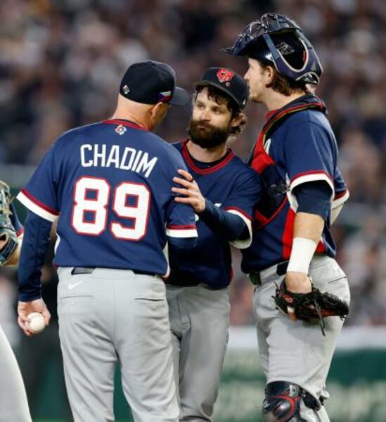 WBC日本戦に先発し、5回途中の降板の際にハジム監督(左)と言葉を交わすチェコのオンジェイ・サトリア投手(中央)=10日、東京ドーム