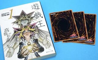 アニメの原作となった人気漫画「遊☆戯☆王」の表紙とカードゲーム