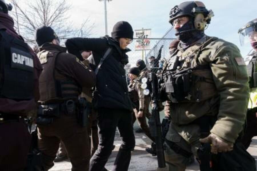 米中西部ミネアポリス近郊で移民取り締まりに抗議し、拘束される人=1日(ロイター=共同)