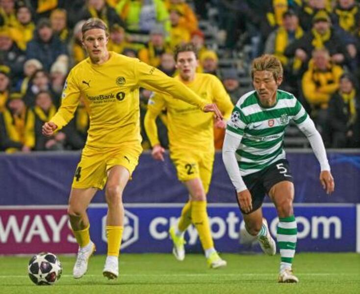 ボデグリムト戦の後半、途中出場したスポルティングの守田(右)=ボーデ(共同)