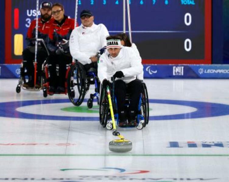 車いすカーリング混合4人制のイタリア代表マテオ・ロンツァニ(手前)=8日、イタリア・コルティナダンペッツォ(共同)