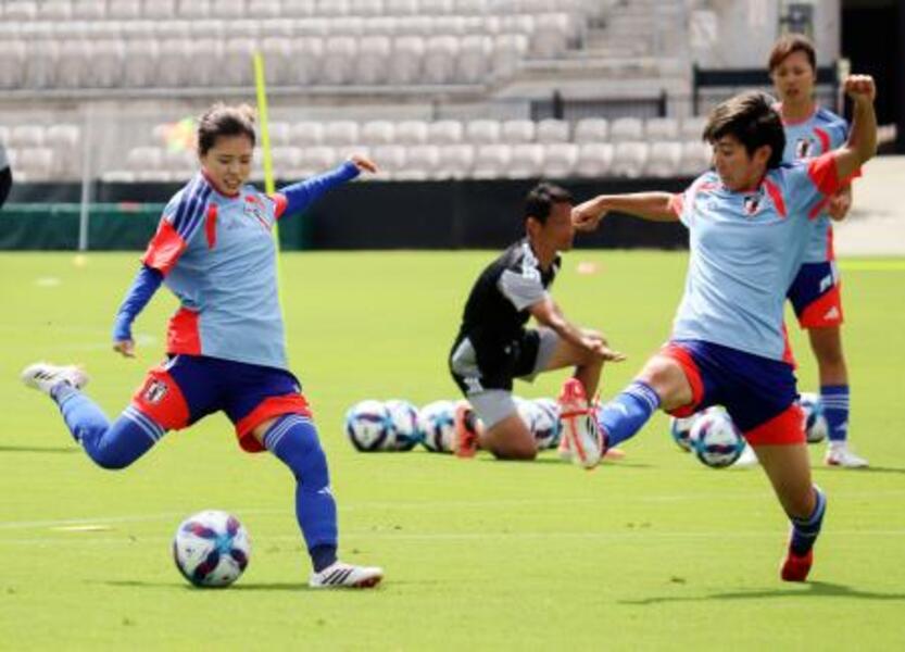 練習でシュートを放つサッカー女子日本代表主将の長谷川(左)=シドニー(共同)