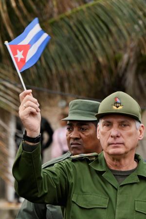 キューバの首都ハバナで自国の国旗を振るディアスカネル大統領=1月(ロイター=共同)