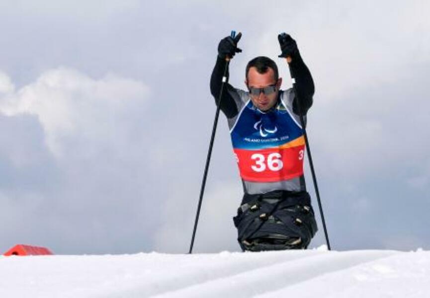 ノルディックスキー距離男子10キロ座位で力走するジョージアのテムリ・ダディアニ=11日、イタリア・テーゼロ(共同)