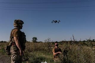 ウクライナ東部ドネツク州での演習で、無人機を飛ばすウクライナ兵士=2023年8月(アナトリア通信提供・ゲッティ=共同)