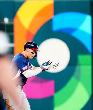 カナダ戦の1回、二塁打を放ち塁上で手をたたく米国のジャッジ=ヒューストン(共同)