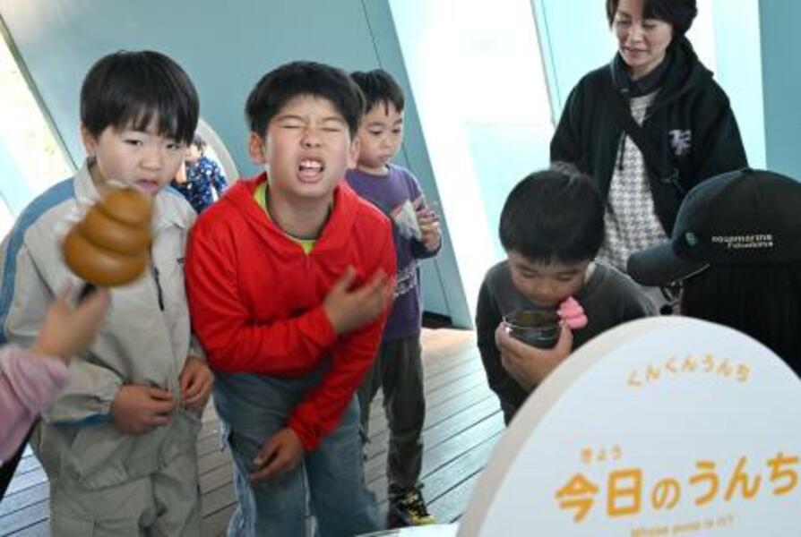 リニューアルしたアクアマリンふくしま内の子ども体験施設で、うんちの臭いを嗅ぐ体験をする小学生ら=14日午後、福島県いわき市