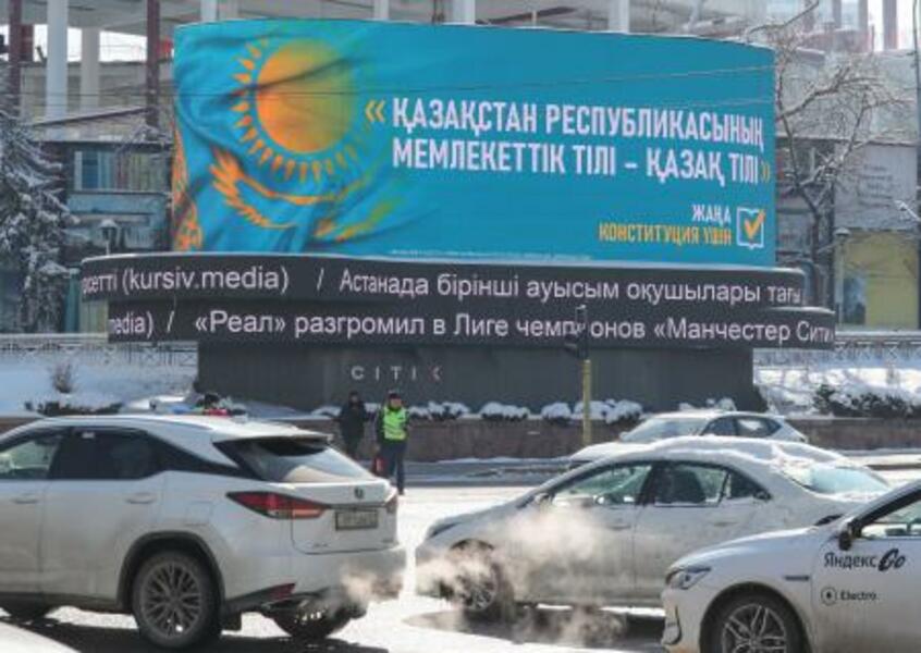 カザフスタン・アルマトイで、新憲法案の是非を問う国民投票実施を伝えるスクリーン=12日(ロイター=共同)