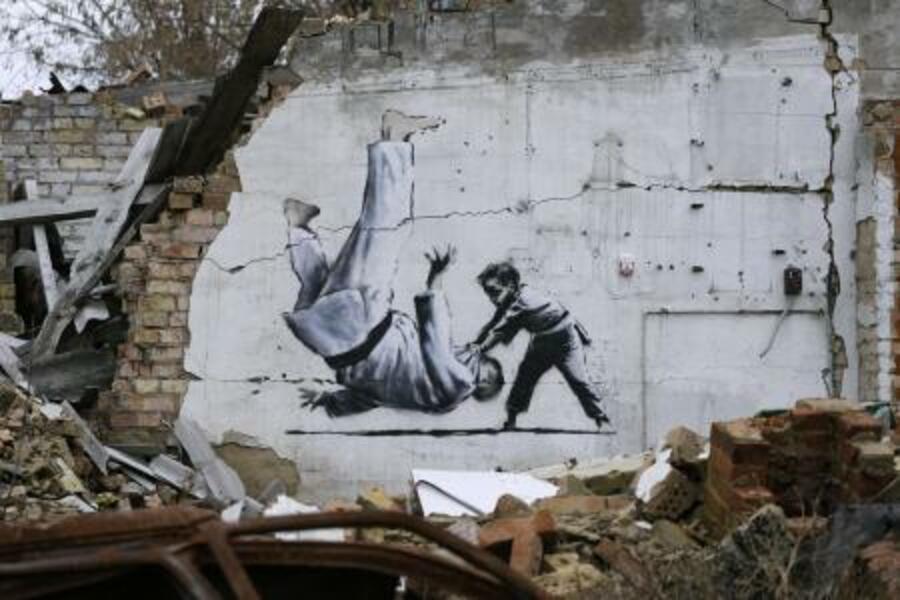 戦闘で半壊した建物の壁に描かれた、小さな男の子が柔道をする絵=2022年11月、キーウ近郊ボロディアンカ(共同)