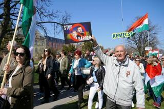 プラカードを掲げるハンガリーの与党「フィデス・ハンガリー市民連盟」の支持者ら=15日、ブダペスト(共同)