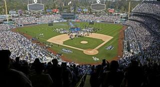 昨年11月、ドジャースのワールドシリーズ優勝報告会が行われたドジャースタジアム=ロサンゼルス(共同)