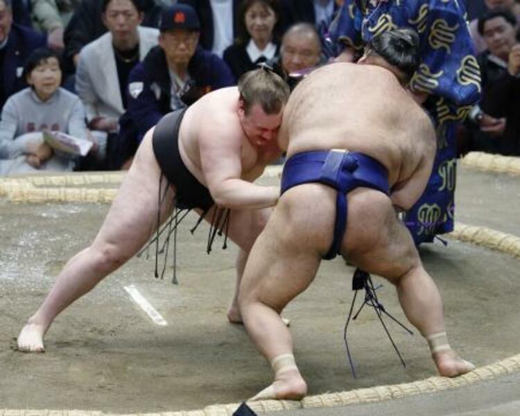 安青錦(左)が押し出しで高安を下す=エディオンアリーナ大阪