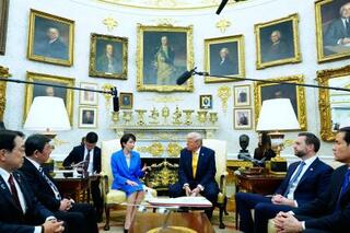 ホワイトハウスで会談する高市首相(奥左)とトランプ米大統領(同右)=19日、ワシントン(AP=共同)