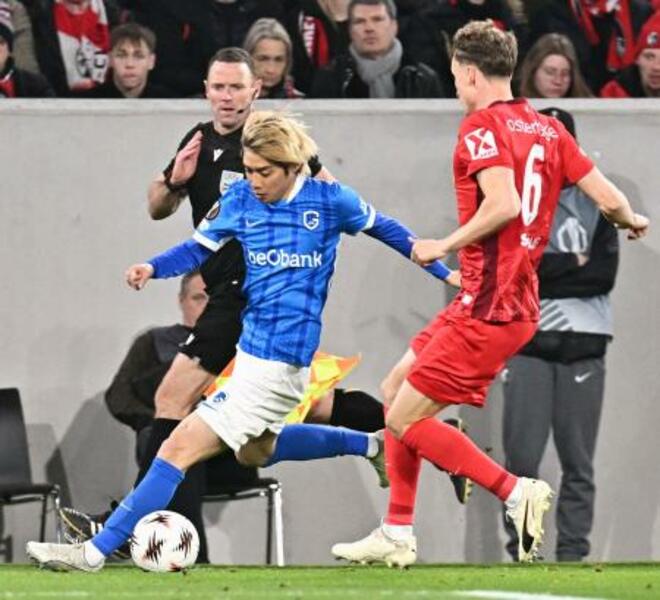フライブルク戦で競り合うゲンクの伊東(左)=フライブルク(共同)