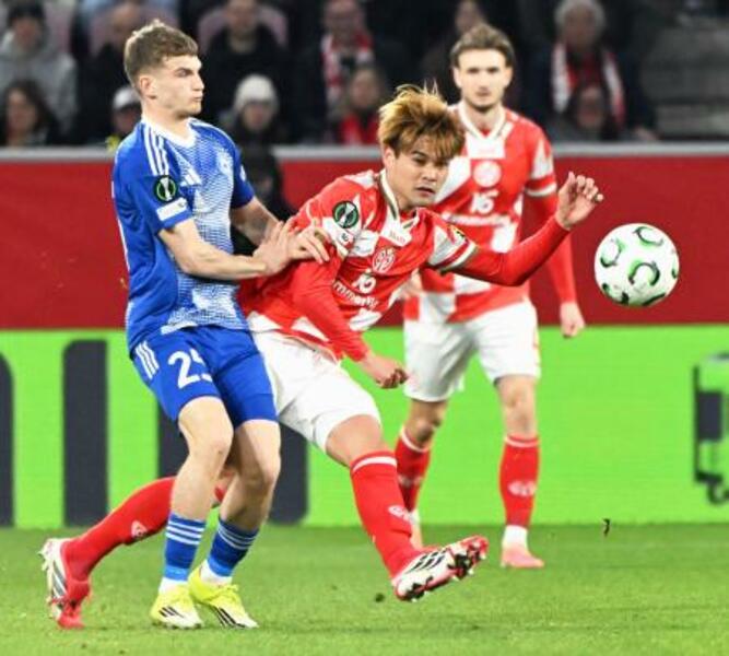 オロモウツ戦で競り合うマインツの佐野(右)=マインツ(共同)