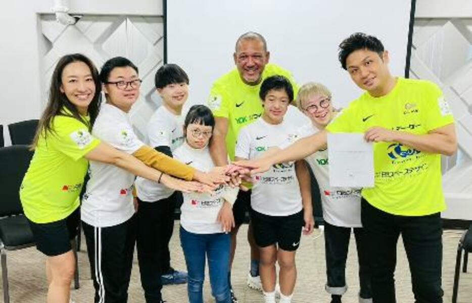 インクルーシブ教育の実現を求める提言書を文科省に提出後、手を合わせるダウン症の当事者や家族ら。右から2人目はあべけん太さん、同4人目はアレックス・ラミレスさん=20日午前、東京都新宿区
