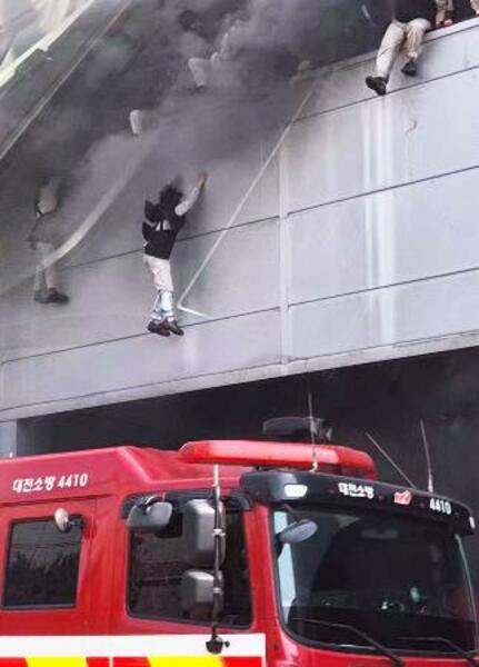 20日、韓国大田の工場火災で脱出する人たち(関係者提供・聯合=共同)