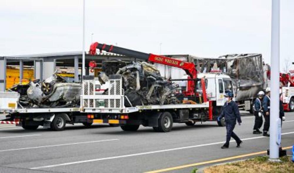 事故があった新名神高速下り線の野登トンネルから運び出された車両(荷台上の2台)とトラック(右奥)=20日午後1時2分、三重県菰野町
