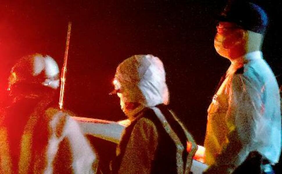 事故現場で実況見分に立ち会う杉林凌容疑者(中央)=21日午前3時43分、富山市