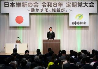 日本維新の会の党大会であいさつする吉村代表=21日午後、東京都内