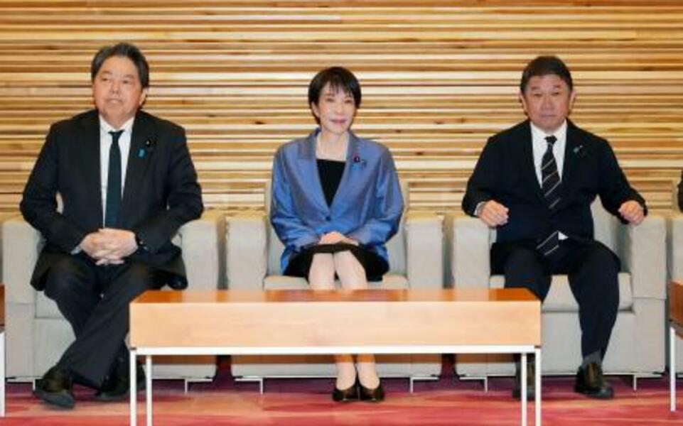 閣議に臨む(左から)林総務相、高市首相、茂木外相=24日午前、首相官邸