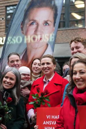 24日、デンマーク・コペンハーゲンで、社会民主党メンバーと並び立つフレデリクセン首相(中央)(AP=共同)