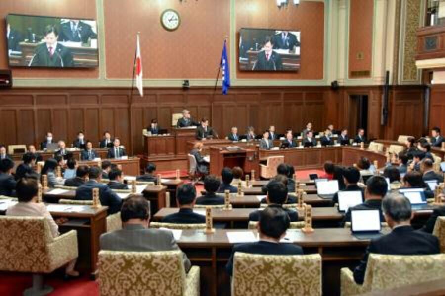 大阪都構想を巡る法定協設置議案について議論する大阪府議会=24日午後