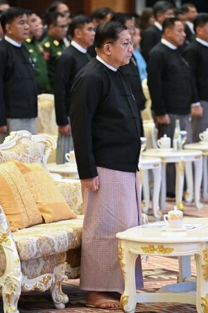 28日、ミャンマーの首都ネピドーで開かれた追悼式で黙とうする軍事政権トップのミンアウンフライン国軍総司令官(共同)